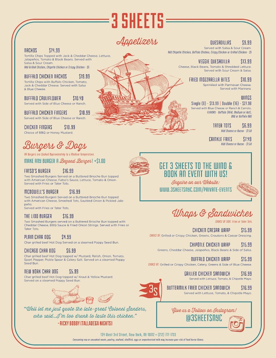Welcome to 3 Sheets, a vibrant bar nestled in the heart of New York City at 134 W 3rd St. This lively spot is a treasure trove for anyone seeking a blend of great drinks, friendly service, and a welcoming atmosphere. With a focus on creating memorable experiences, 3 Sheets has quickly made a name for itself among locals and visitors alike.